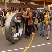 Dann rollte das Rad durch die Altstadt von Sarajevo und verband neben der Kathedrale die älteste Moschee und serbisch-orthodoxe Kirche mit der Synagoge. Jedesmal wurde ein Sandabdruck hinterlassen. Der stellvertretende Bürgermeister und die Religionsvertreter begleiteten das Rad die ganze Strecke. Vor der Synagoge wurde eine Dauerhafte Bodenintarsie gelegt, die an diesen Besuch auf alle Zukunft erinnert.