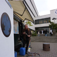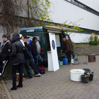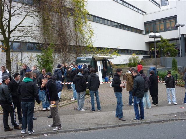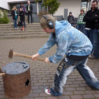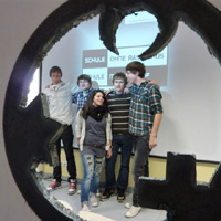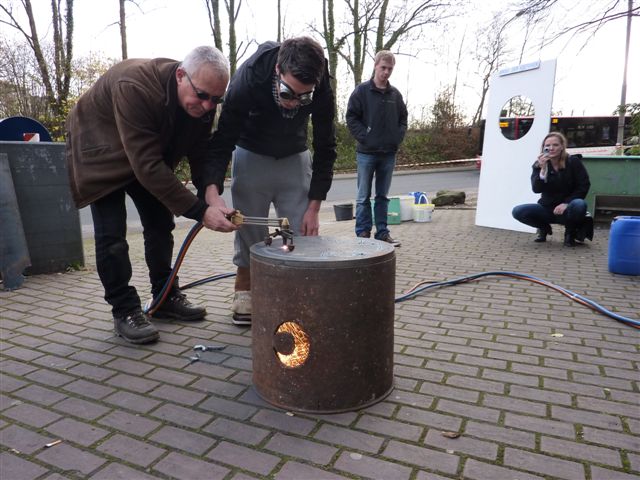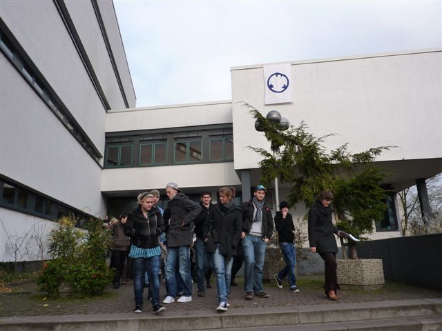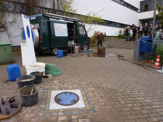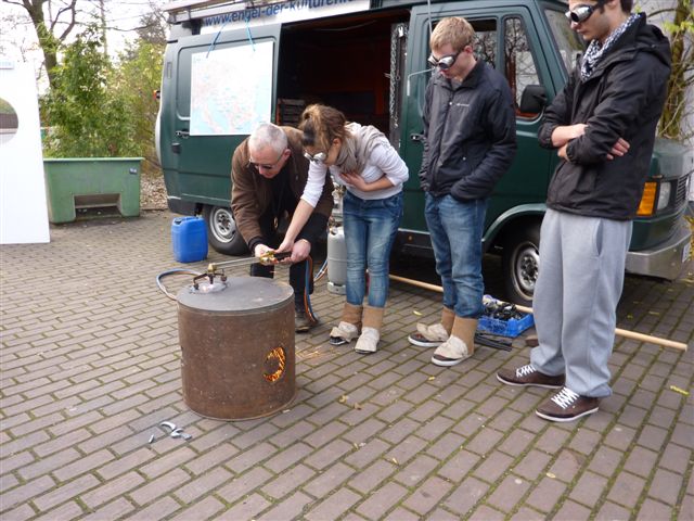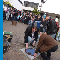Gemeinsam mit den SchülerInnen des BKO Verlegung der Bodenintarsie, die am 2. Oktober 2010 von SchülerInnen der Richard-Schirmann-Realschule in Essen hergestellt worden ist, und Ausbrennen des Zeichens für die nächste Aktion am 24. November 2010 in Solingen, Fronhof.
