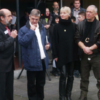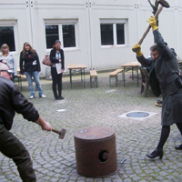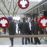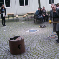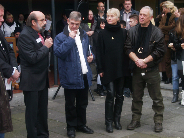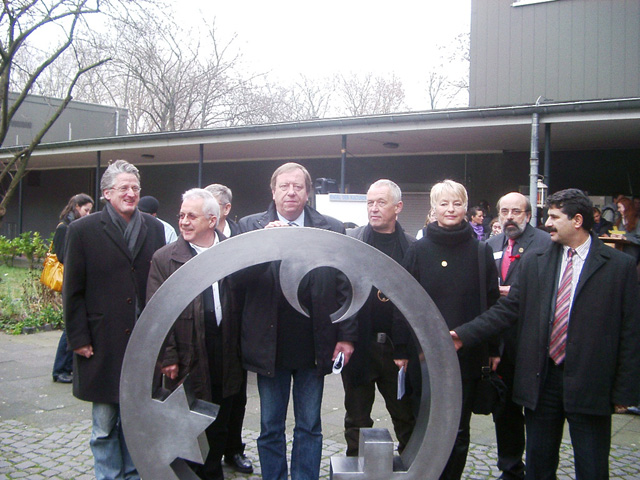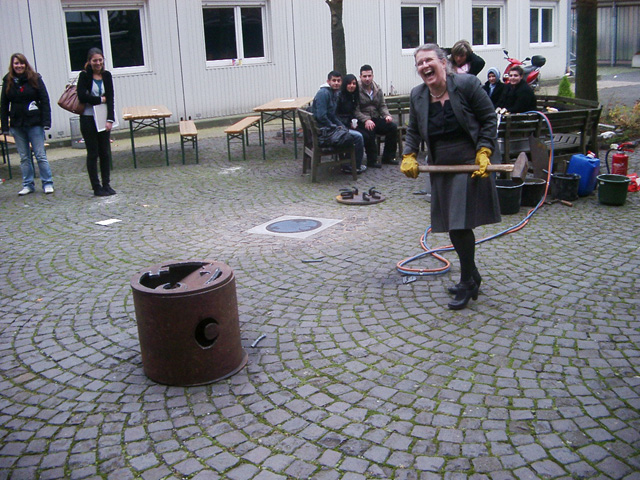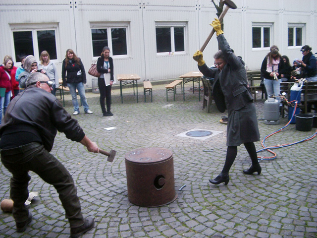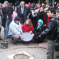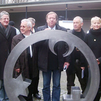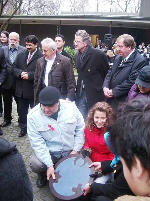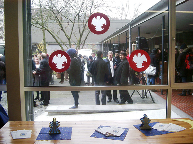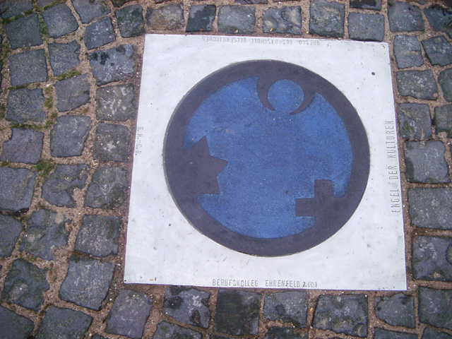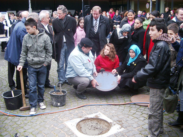 Verlegung der Bodenintarsie des Engels der Kulturen und Ausbrennen des Zeichens für nächste Station unter Beteiligung von Vertretern der verschiedenen Religionsgemeinschaften und der Öffentlichkeit