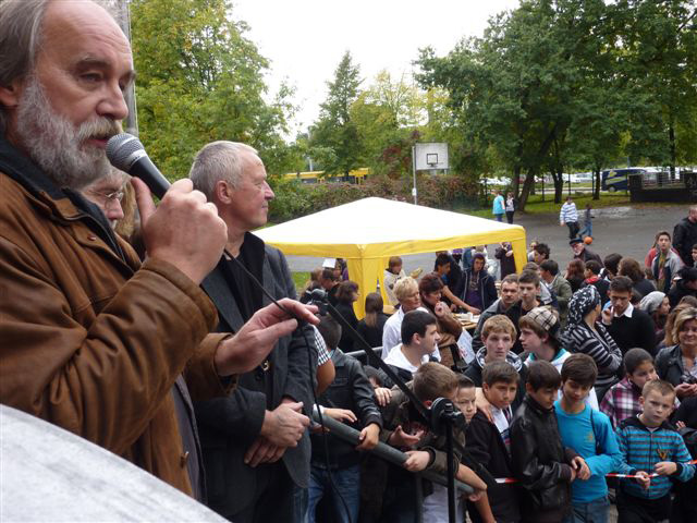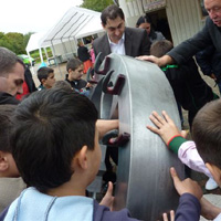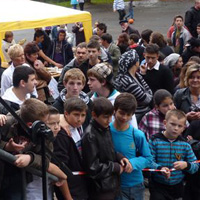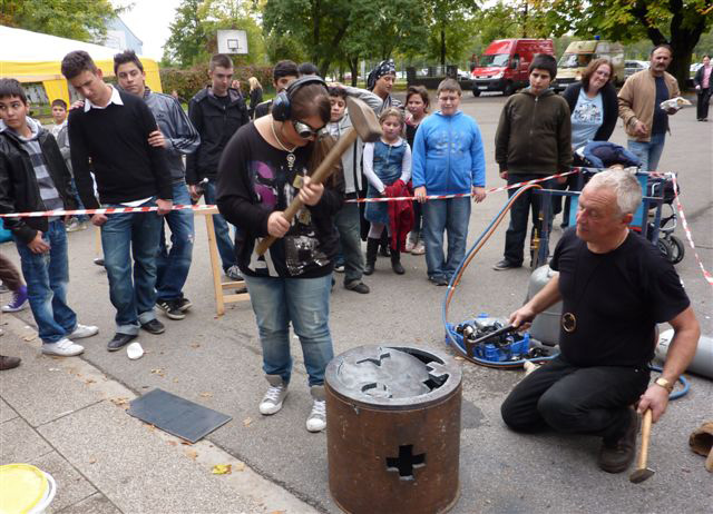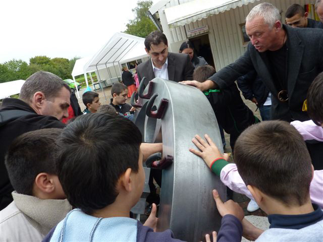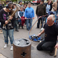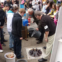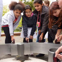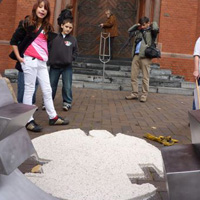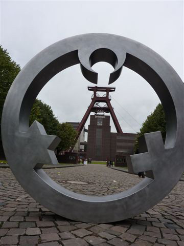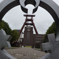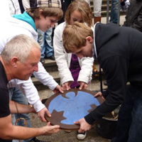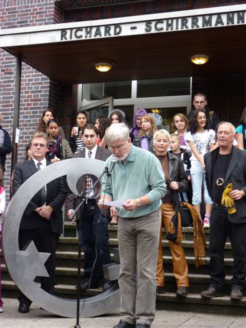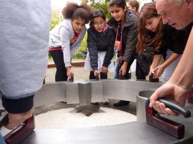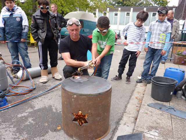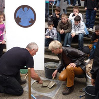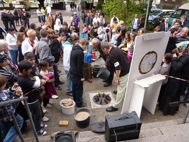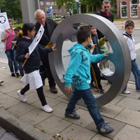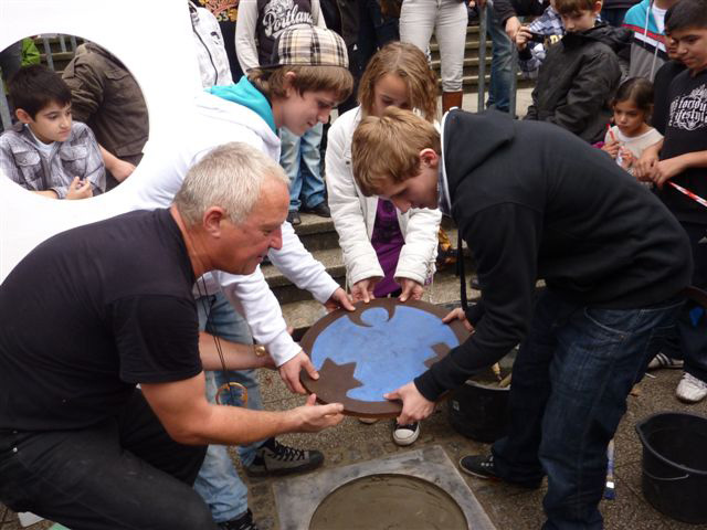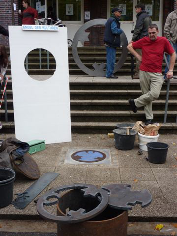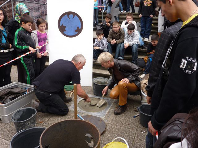 Weiter geht es - vorbei an der Zeche Zollverein - zum Schulhof der Richard-Schirrmann-Realschule, wo wir schon erwartet werden im Rahmen des Schulfestes zum 55. Schuljubiläum. Hier verlegen wir die Bodenintarsie des Engels der Kulturen und brennen gemeinsam mit einigen Schülerinnen und Schülern das Zeichen für die nächste Stadt aus.