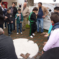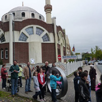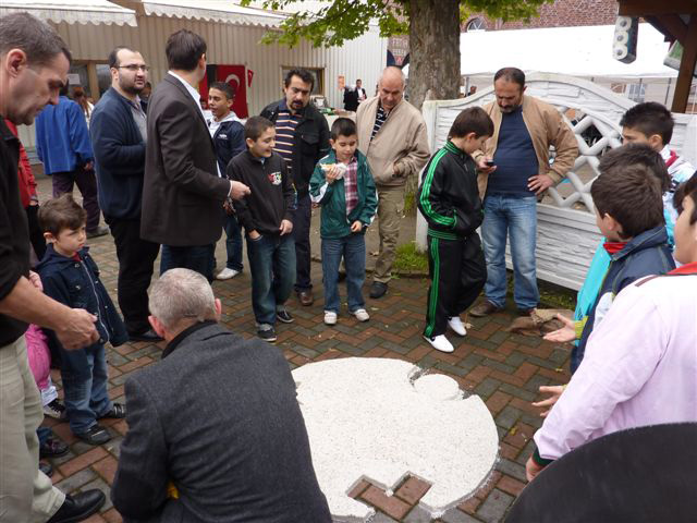 Treffpunkt ist die Katernberger Moschee, wo an diesem Wochenende Tage der offenen Moscheee stattfinden. Hier erzeugen wir gemeinsam mit den Jugendlichen und den Vertretern der Moscheegemeinde einen Sandabdrucke des Engels der Kulturen, der bis zum Sonntag verbleibt.