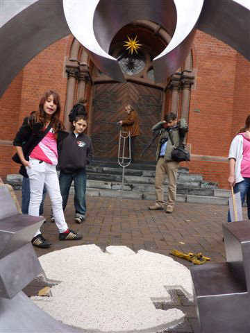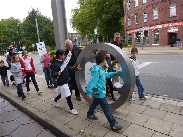 Von dort bewegen wir uns mit der rollenden Skulptur zusammen mit SchülerInnen, deren Eltern und Lehrern der Richard-Schrirmann-Realschule zur evangelischen Kirche am Katernberger Markt, wo wir von Pfarrer Leich in die Kirche eingeladen werden und er freundlich die Fragen der Kinder beantwortet.