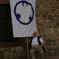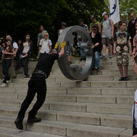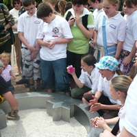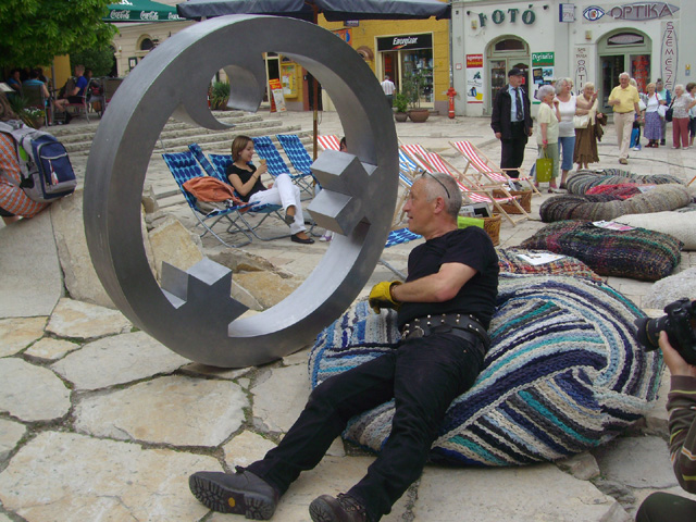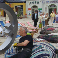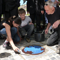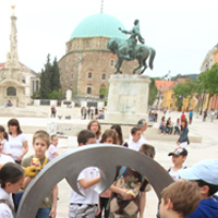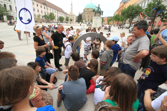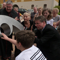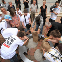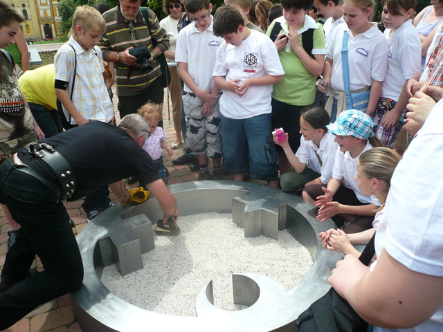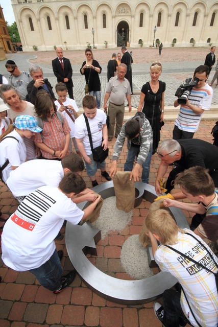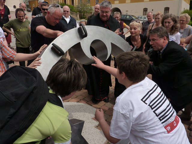 Zurück zum Domplatz in Pecs: Willi Overbeck,. evangelischer Pfarrer aus Essen, stellte das Projekt vor. Dann sprachen ein muslimischer Vertreter und ein Mitglied der jüdischen Kultusgemeinde aus dem Ruhrgebiet und der Generalvikar aus Pecs. Zahlreiche Journalisten begleiteten diesen Akt, ebenso Kinder aus zwei internationalen Schulen, die aktiv mithalfen. Der Mittelpunkt der Karawane, der Engel der Kulturen, wurde dann als Zeichen der drei „Abraham-Religionen“, Islam, Judentum, Christentum erklärt. Das Rad wurde dann vor dem Dom auf den Boden gelegt und das Innere mit Sand gefüllt. Die Religionsvertreter, die Künstler Gregor Merten und Carmen Dietrich und viele Kinder nebst dem Generalvikar hoben das Rad dann wieder an und zurück blieb ein Sandabdruck, der die Form eines Engels hat.