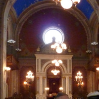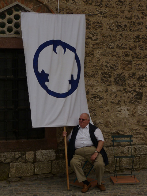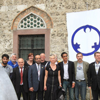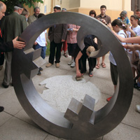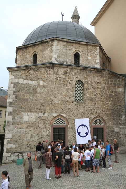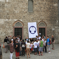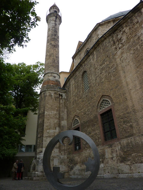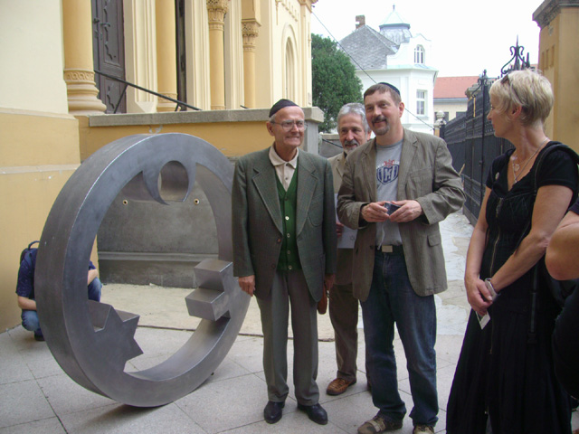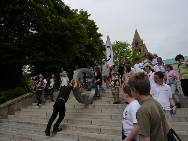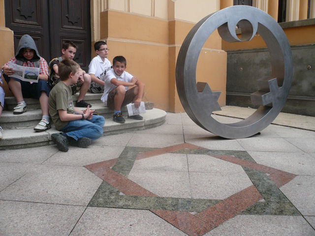 Dann wurde das 1,50 Meter große und rund 100 Kilogramm schwere Kunstwerk aus Kruppstahl durch die Altstadt von Pecs gerollt, von der katholischen Bischofskirche zu einer islamischen Kultstätte aus dem 16. Jahrhundert, dem Dschami und dem Minarett des Jakovali Hassan. Jetzt ist es Museum, wird aber von der kleinen moslemischen Gemeinde für das Freitagsgebet genutzt. Dort erwartete die Begleiter des Rades eine Abordnung der Gemeinde, ein Sudanese, ein Jemenit und ein Syrer. Ein weiterer Sandabdruck wurde gefertigt. Dann ging es weiter zur jüdischen Synagoge, die gerade renoviert wird. Auch dort ein sehr freundlicher Empfang durch den Gemeindevorsteher und einen weiteren Amtsträger. Vor der Synagoge entstand ein neuer „Engel der Kulturen“ aus Sand. Für die Gäste war die Größe der Synagoge beeindruckend, die auch die frühere Größe der jüdischen Gemeinde zeigt, Jetzt leben noch ca. 100 Juden in Pecs.