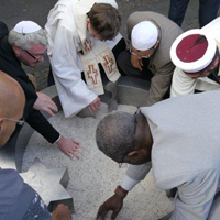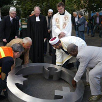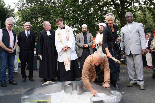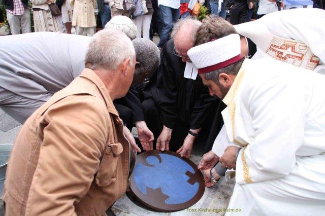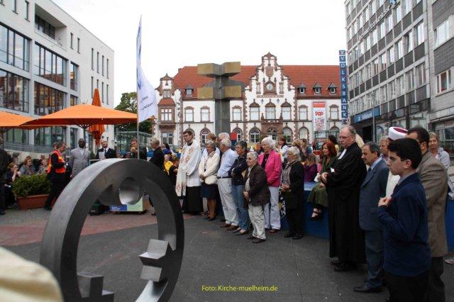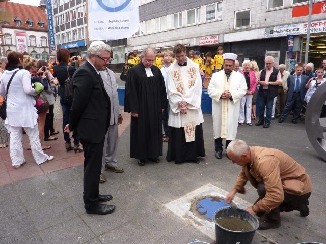 Auf dem Synagogenplatz in der Mülheimer Innenstadt wird nach weiteren Beiträgen u.a. der Religionsvertreter die Bodenintarsie Engel der Kulturen dauerhaft installiert. Im Anschluß beteiligen sich u.a. Religionsvertreter an der Herstellung der Intarsie für die nächste Stadt, in diesem Fall Essen, wo sie am 23. September 2012 im Rahmen der feierlichen Eröffnung der Interkulturellen Woche vor dem Bergmannsdom am Katernberger Markt verlegt wird.