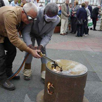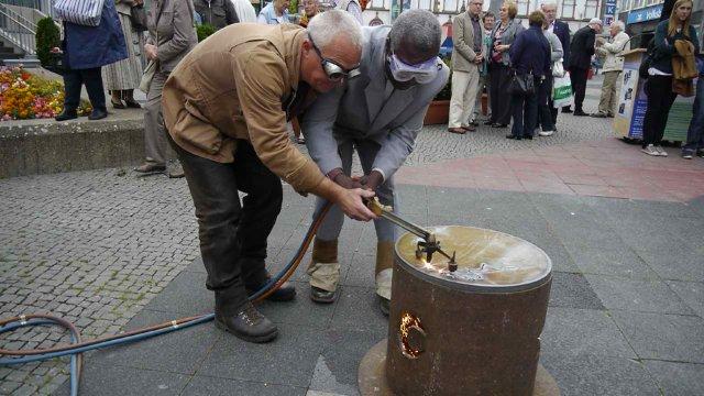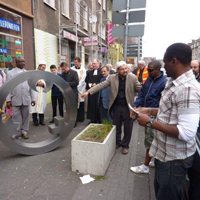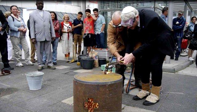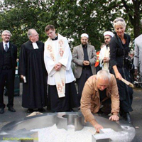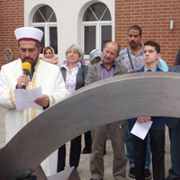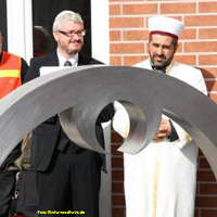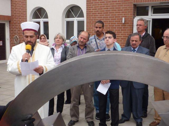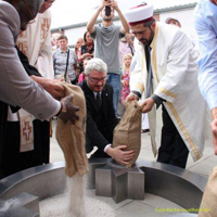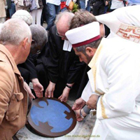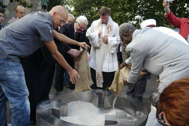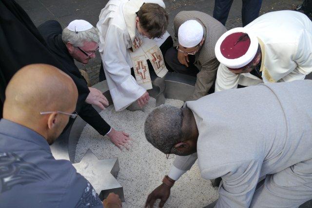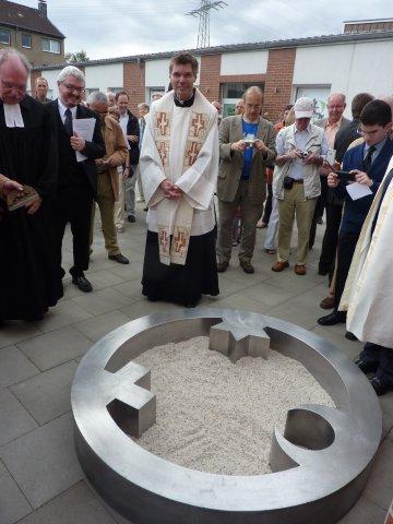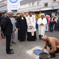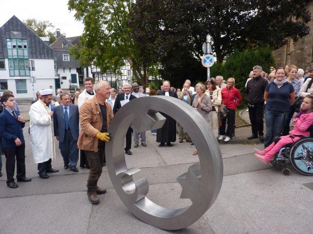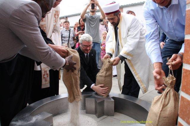 Die Kunstaktion startet an der Fatih Moschee in der Sandstraße. Viele interessierte Bürgerinnen und Bürger besichtigen zunächst mit dem Vorsteher der Gemeinde die Moschee. Im Anschluß erzeugen Imam Giyasettin Korkutata, Stadtdechant Michael Janßen, Rabbiner Paul Strasko, Reverend Emmanuel Ohene-Bonsie und Superintendent Helmut Hitzbleck gemeinsam einen Sandabdruck und sprechen Friedensgebete. Im Anschluß begleiten alle den Engel der Kulturen zum Kirchenhügel – St. Mariae Geburt und Petrikirche –, wo der Zug von vielen weiteren Bürgern und Gemeindemitgliedern empfangen wird. Auch hier wird zur symbolischen Verbindung der Stationen in Mülheim von den Geistlichen ein temporäres Sandbild erstellt und Worte des Friedens gesprochen.