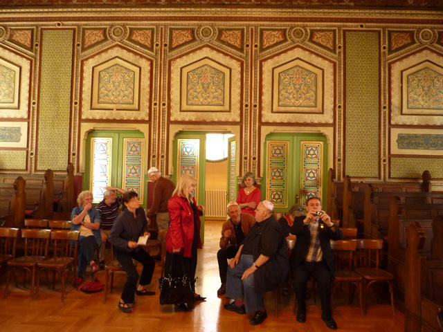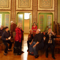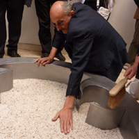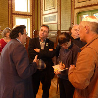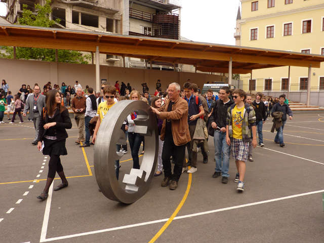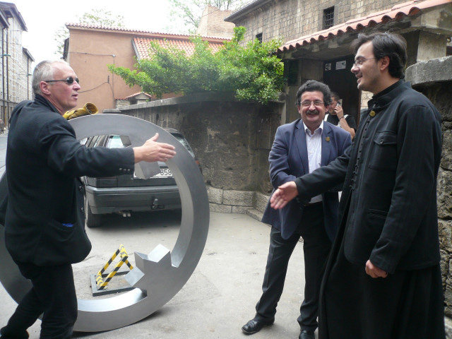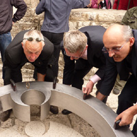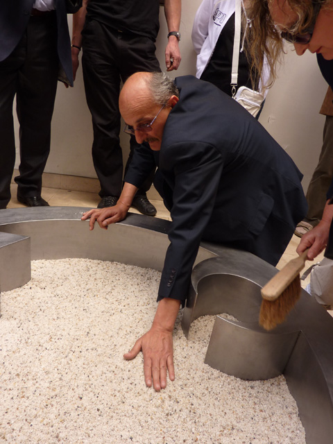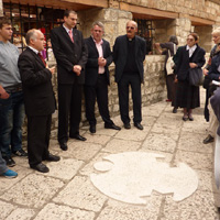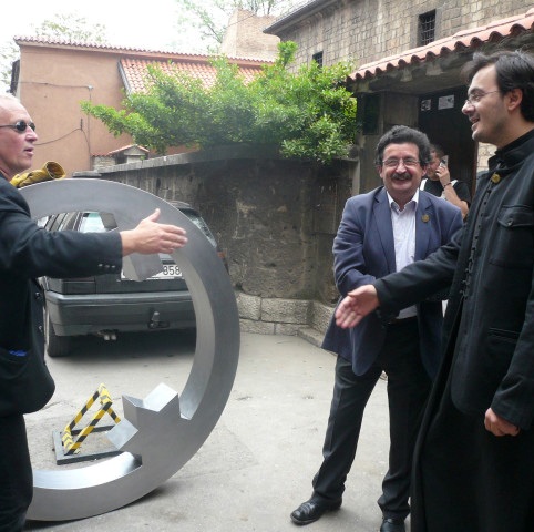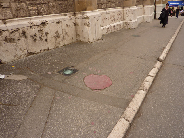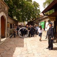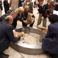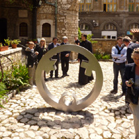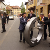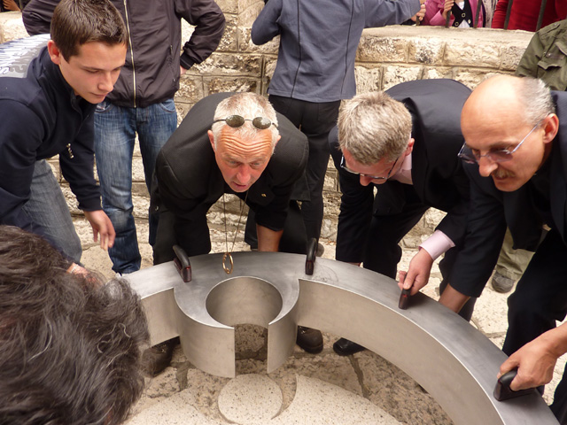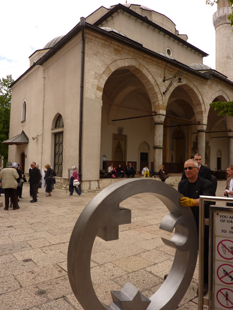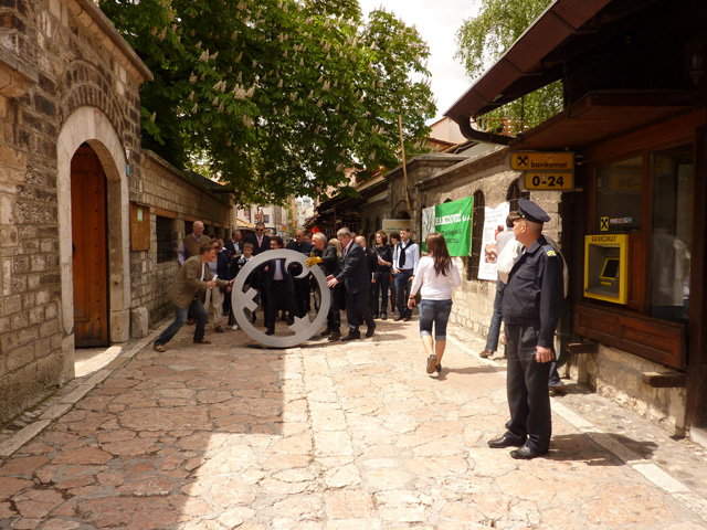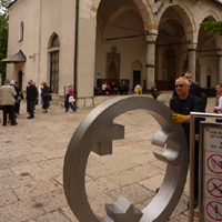 Dann rollte das Rad durch die Altstadt von Sarajevo und verband neben der Kathedrale die älteste Moschee und serbisch-orthodoxe Kirche mit der Synagoge. Jedesmal wurde ein Sandabdruck hinterlassen. Der stellvertretende Bürgermeister und die Religionsvertreter begleiteten das Rad die ganze Strecke. Vor der Synagoge wurde eine Dauerhafte Bodenintarsie gelegt, die an diesen Besuch auf alle Zukunft erinnert.