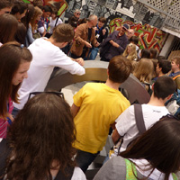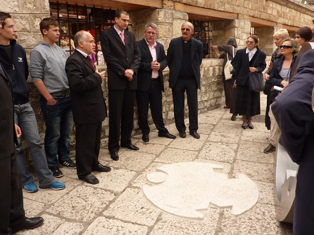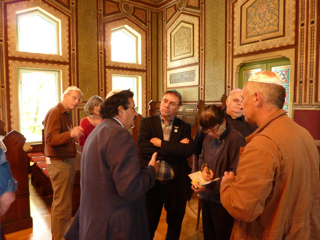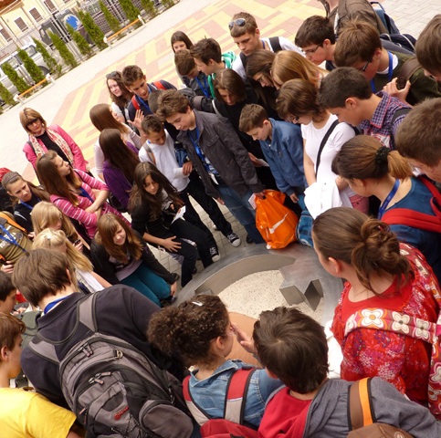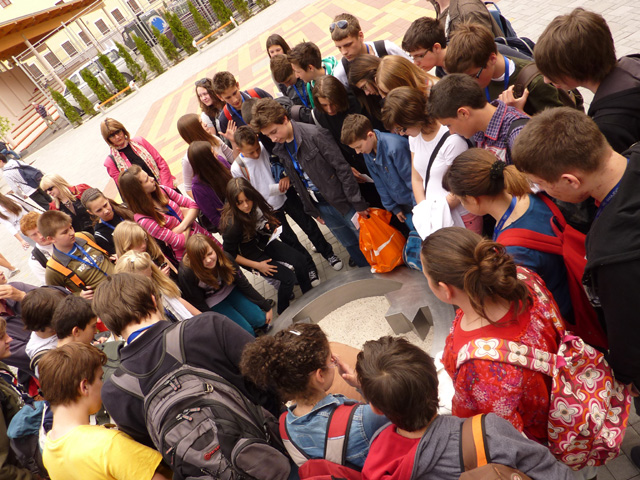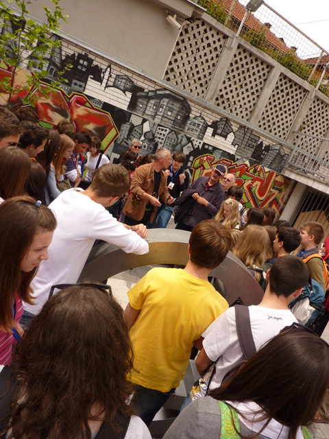 Am Tag darauf besuchte die Abraham-Karawane die Europa-Schule, die von 1.300 Schülern besucht wird, die unterschiedlichsten Religionen angehören. Auf dem Schulhof wurde der Sinn dieser Aktion erklärt und gemeinsam mit den Schülern ein Sandabdruck gelegt. Ein Besuch in der neuen Synagoge schloss sich an.