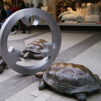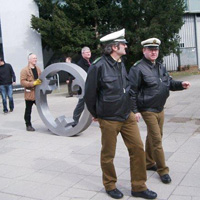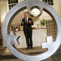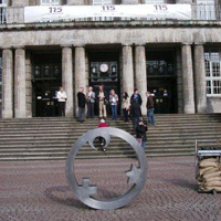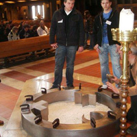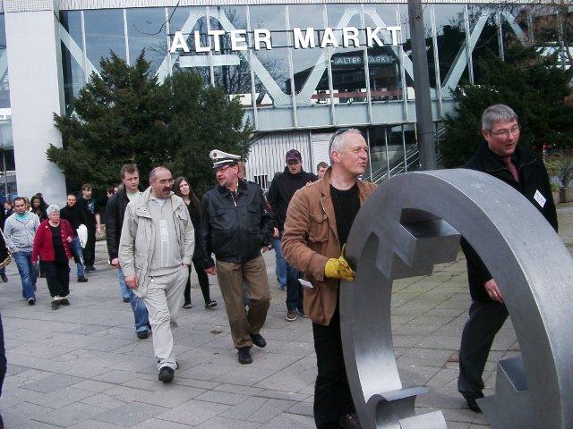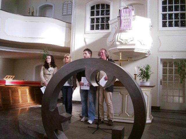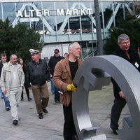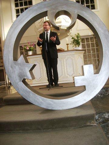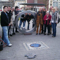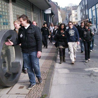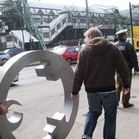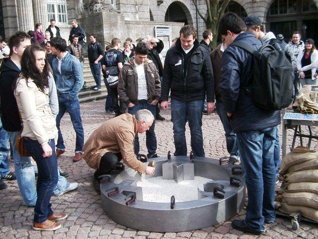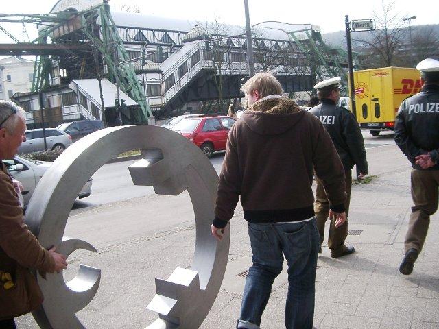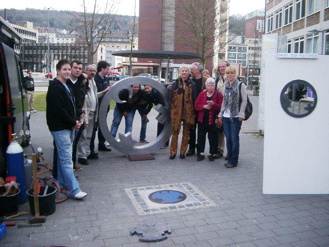 Am Vormittag führen wir gemeinsam mit SchülerInnen und LehrerInnen des Berufskollegs die Aktion mit der rollenden Skulptur in der Wuppertaler Innenstadt durch. Wir starten an der Wupperfelder Kirche, gehen dann zum Rathaus, weiter zur Synagoge, zur Kirche St. Antonius und zur DITIB-Moschee. An jeder Station wird an diesem Morgen ein temporäres Sandbild des Engels der Kulturen gelegt. Die Glaubenseinrichtungen hatten einige der SchülerInnen schon vorher im Zusammenhang mit ihrem Projekt „Gott in Wuppertal – Weg der Hoffnung“ aufgesucht, um die Gemeinsamkeiten und Unterschiede der 3 abrahamitischen Weltreligionen zu erforschen.