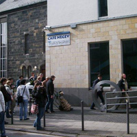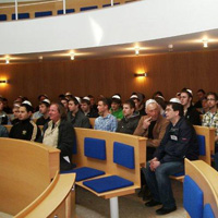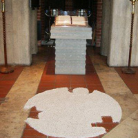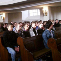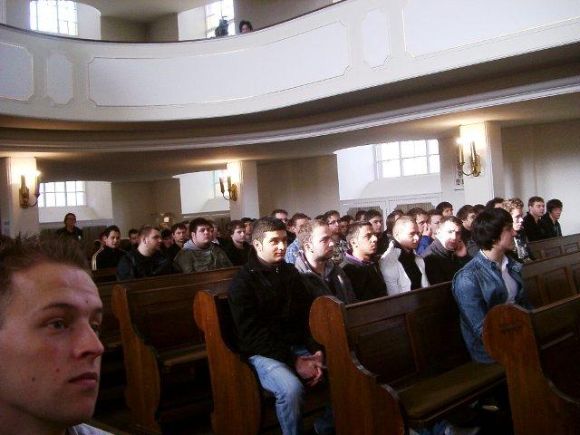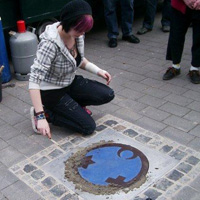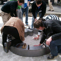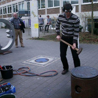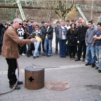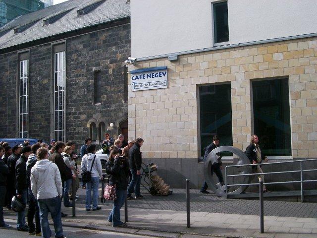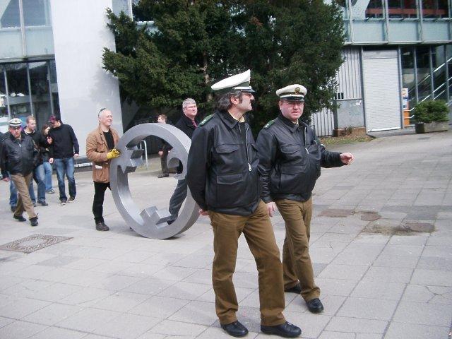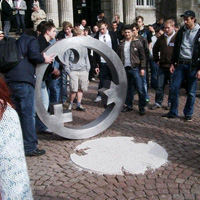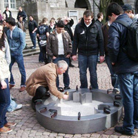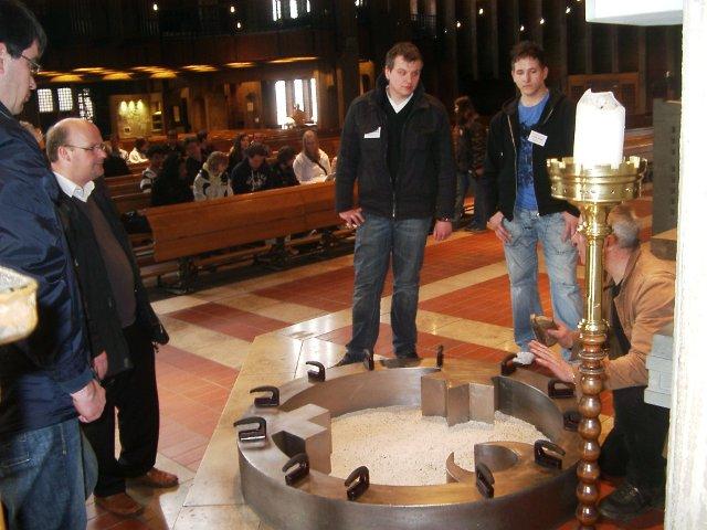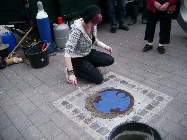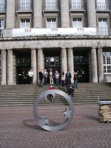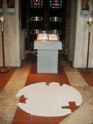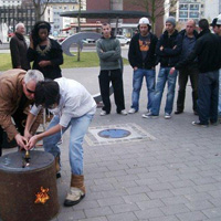 Am Nachmittag verlegen wir auf dem Schulhof des Berufskollegs die Bodenintarsie, die in der Vorwoche an der Pestalozzi-Realschule Bochum unter Anwesenheit von israelischen, palästinensischen und türkischen GastschülerInnen entstanden ist, und brennen im Anschluß das Zeichen für die nächste Station aus (10. April in Marl, Nacht der offenen Gotteshäuser).