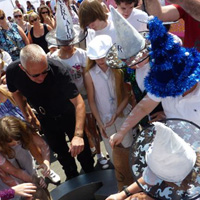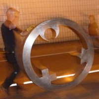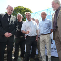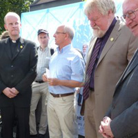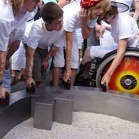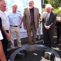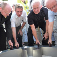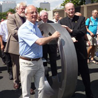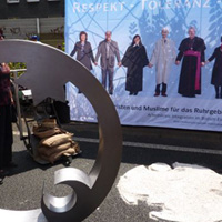Temporäre Aktion des Engels der Kulturen mit Ruhrbischof Dr. Franz-Josef Overbeck, Dr. Alfred Buß, Präses der Evangelischen Landeskirche von Westfalen, Essens Oberbürgermeister Reinhard Paß und vielen anderen am Tisch der Religionen/ Akademie Wolfsburg. Ein weiterer Sandabdruck entsteht mit Kindern der Opera School, Hattingen.