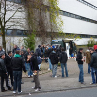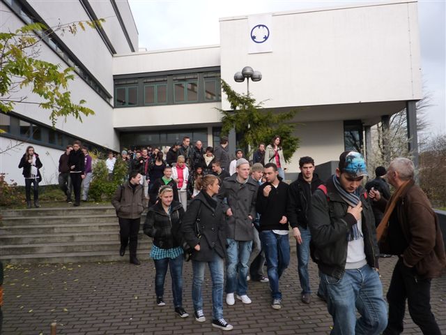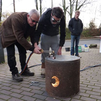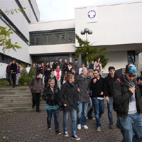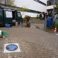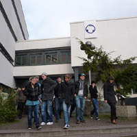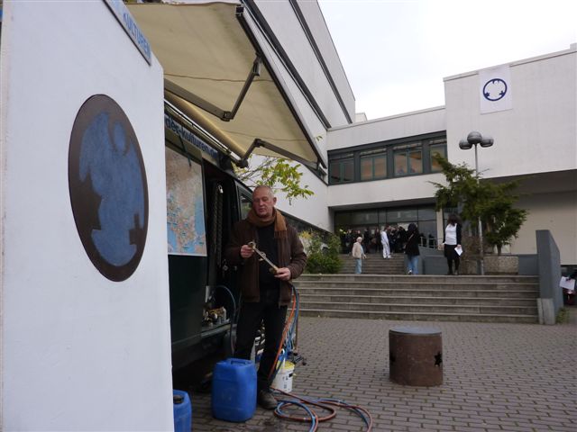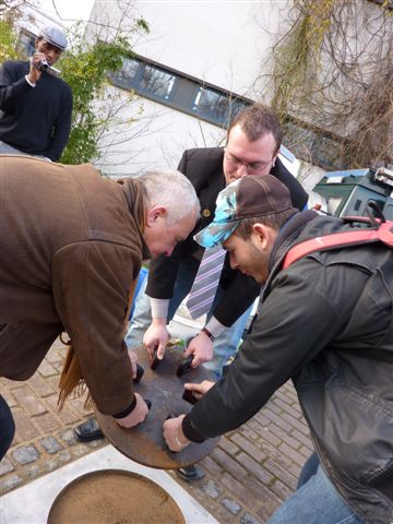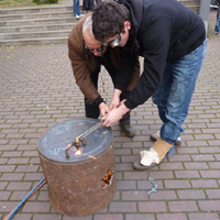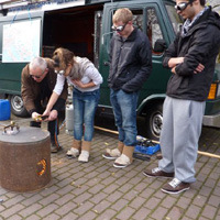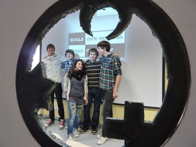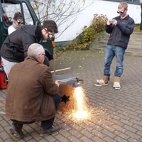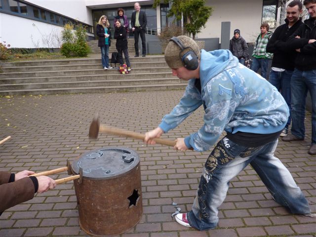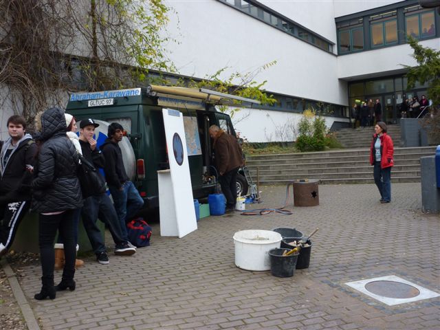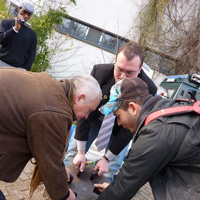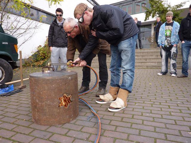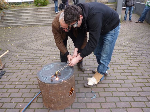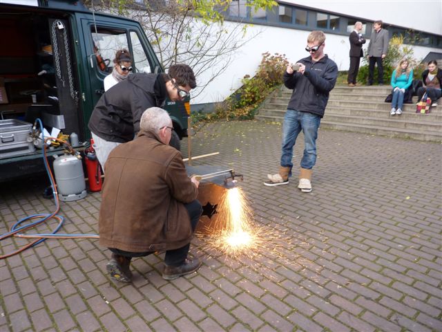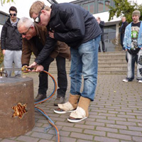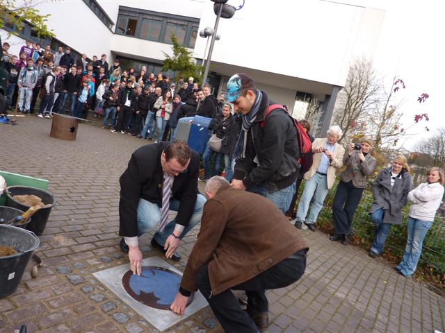 Gemeinsam mit den SchülerInnen des BKO Verlegung der Bodenintarsie, die am 2. Oktober 2010 von SchülerInnen der Richard-Schirmann-Realschule in Essen hergestellt worden ist, und Ausbrennen des Zeichens für die nächste Aktion am 24. November 2010 in Solingen, Fronhof.
