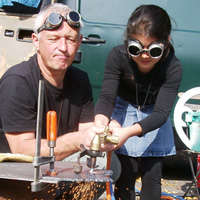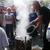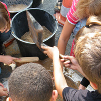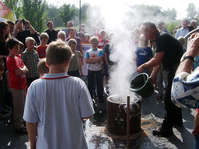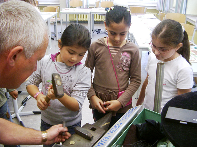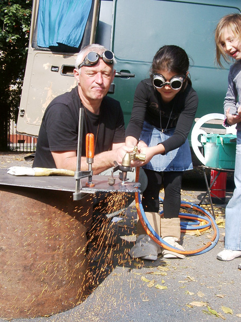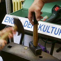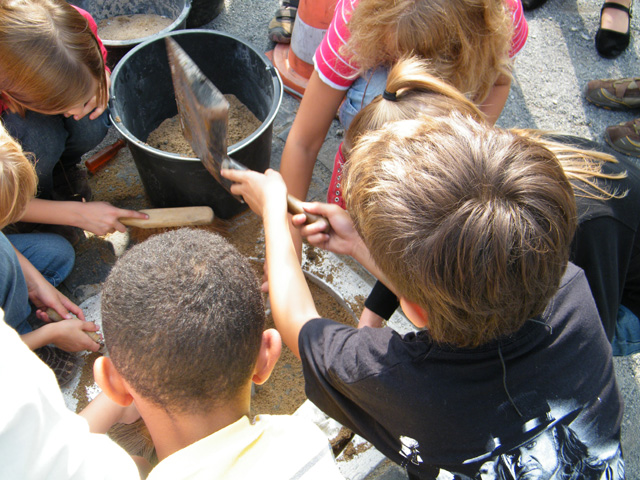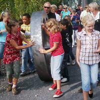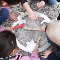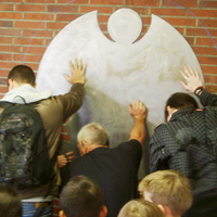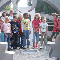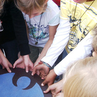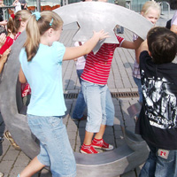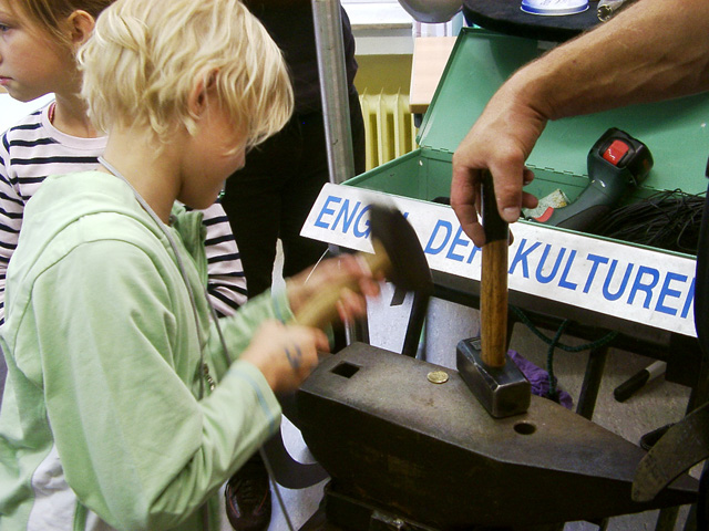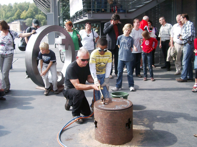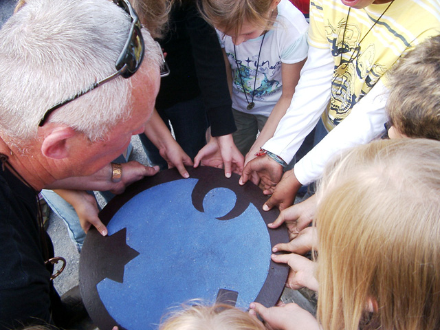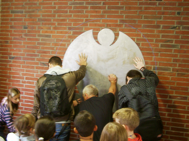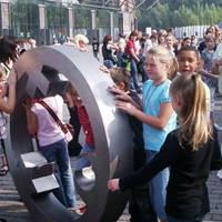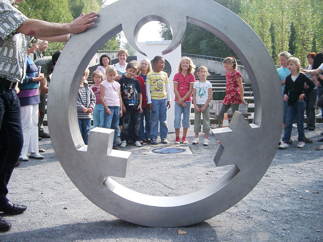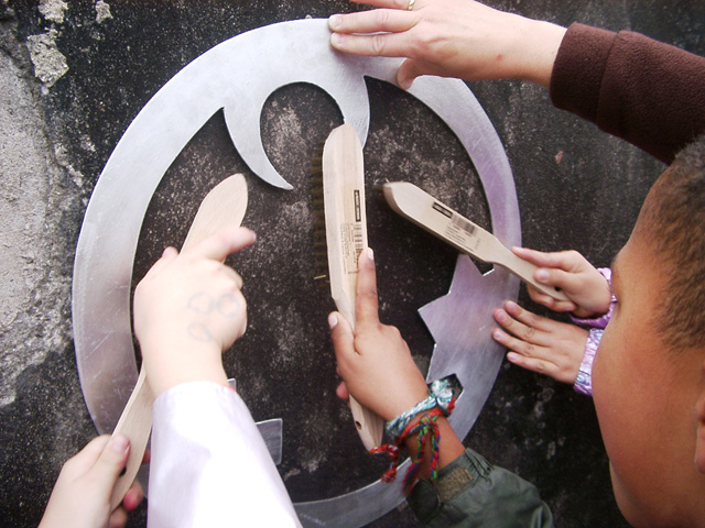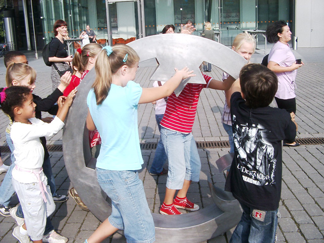 Mit den Kindern, die wir bereits in den Tagen zuvor an der Schule auf das Thema und die damit verbundenen Aktionen vorbereitet haben, verlegen wir am 20. September 2009 gemeinsam eine Bodenintarsie des Engels der Kulturen vor der Jahrhunderthalle. Im Anschluß daran brennen wir das Zeichen für die nächste Stadt aus (Gesamtschule Gelsenkirchen-Ückendorf). Parallel zu diesen Aktionen erzeugen die Kinder auf dem Gelände um die Jahrhunderthalle herum mit Hilfe von Aluminium-Schablonen und Stahlbürsten „reverse graffitis“ des Engels der Kulturen, wobei durch Säubern der Flächen mit den Bürsten das Bild bleibend entsteht.