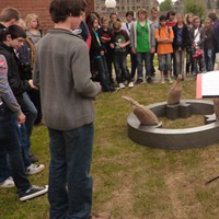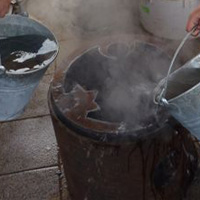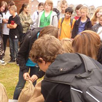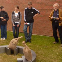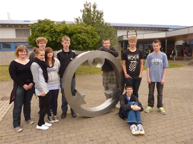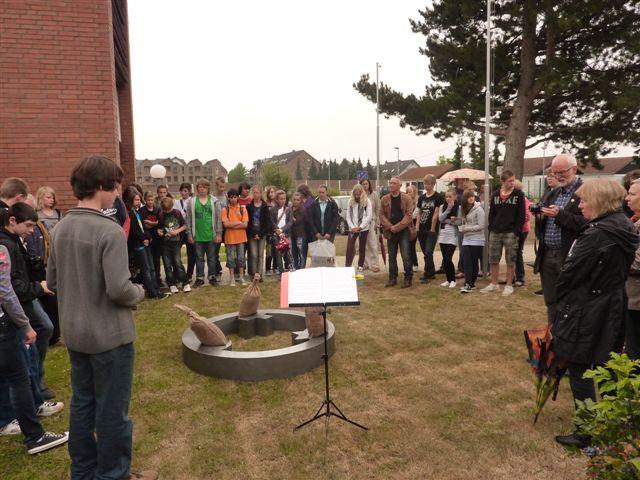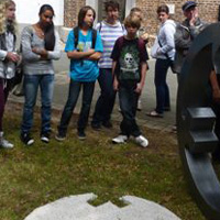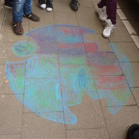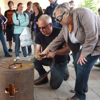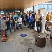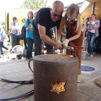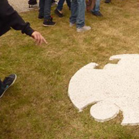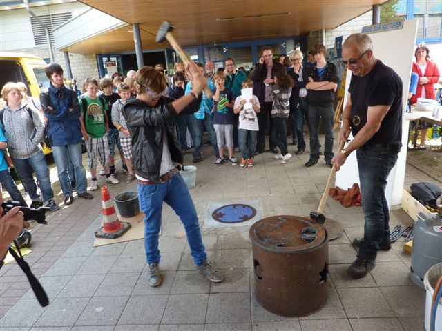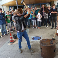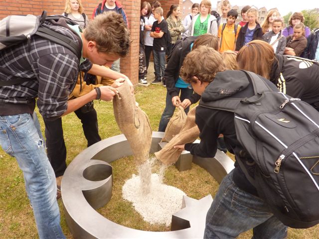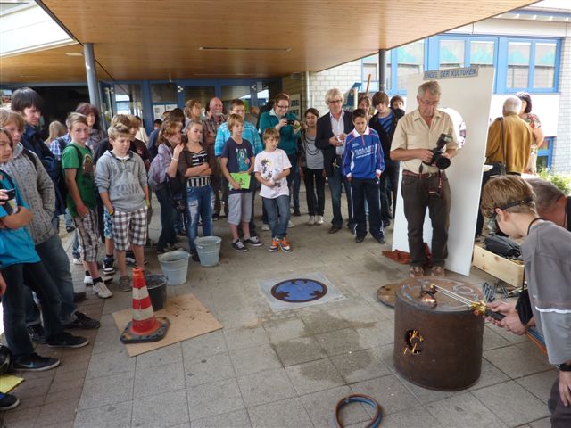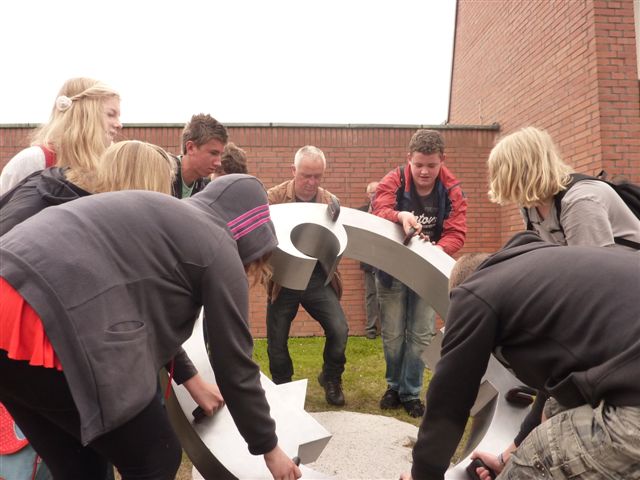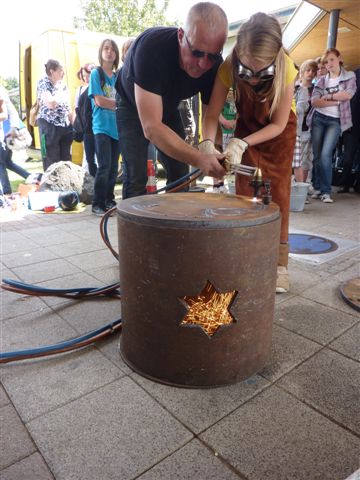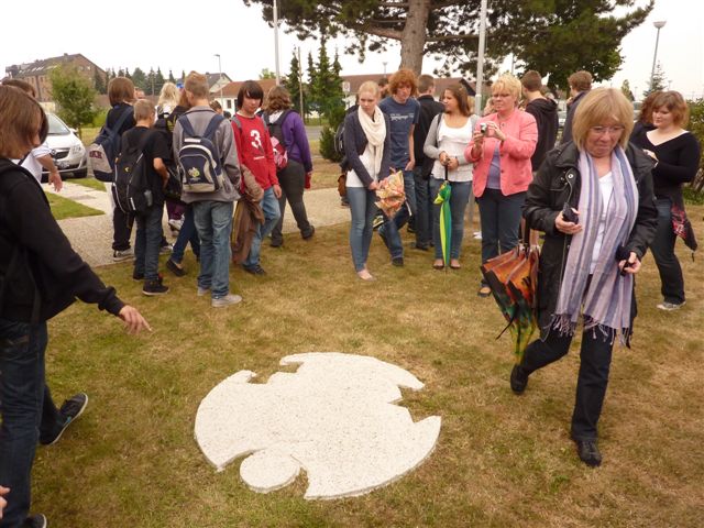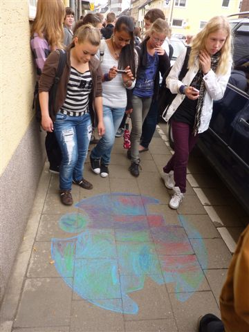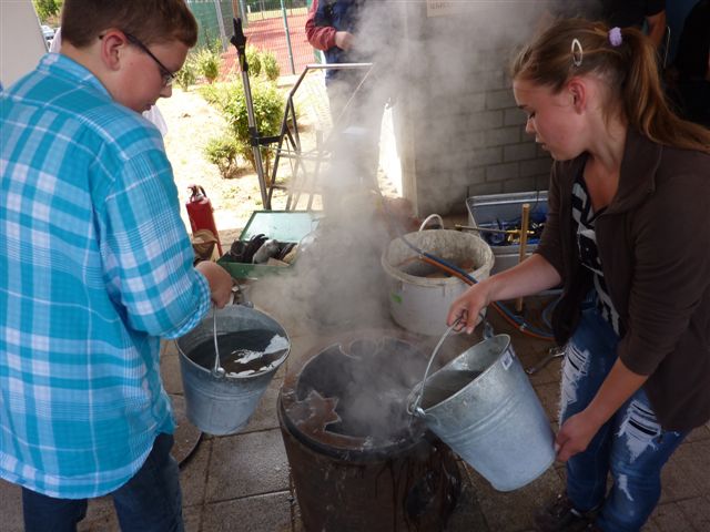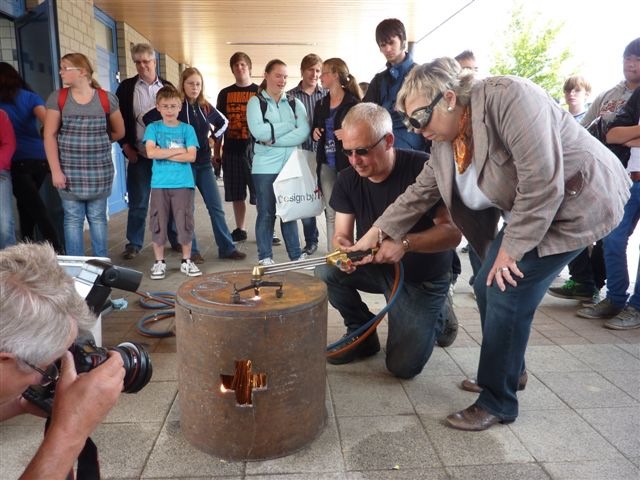 Nachmittags verlegen wir auf dem Schulgelände die dauerhafte Bodenintarsie und brennen mit den Jugendlichen das Zeichen für die nächste Stadt aus.