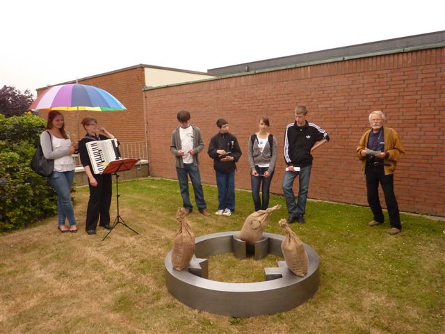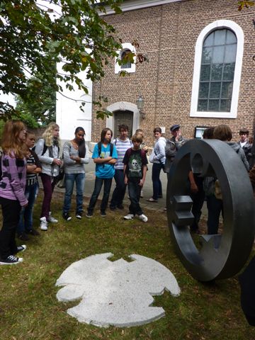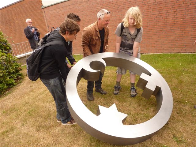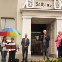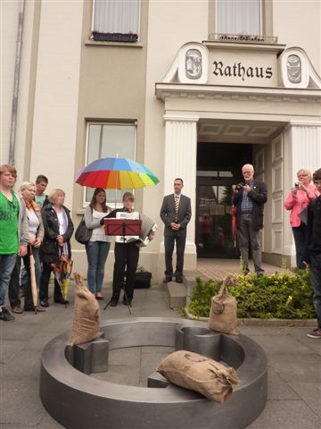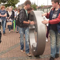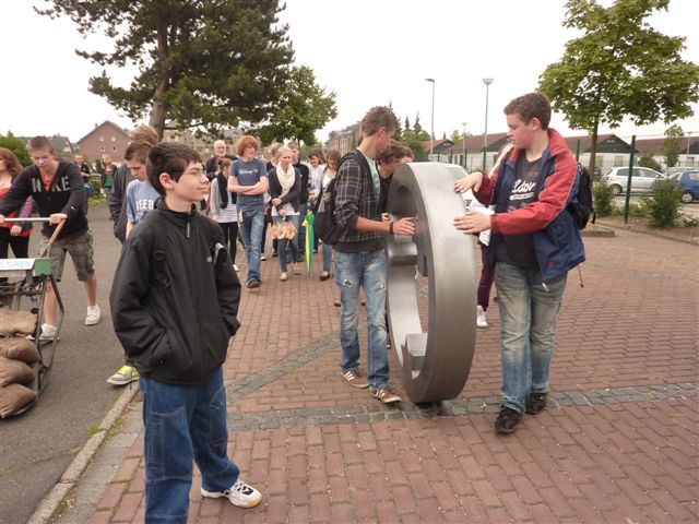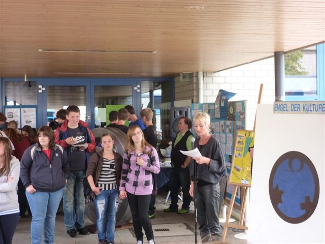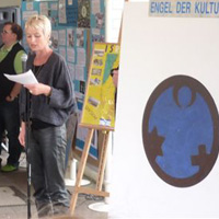 Gemeinsam mit Schülerinnen und Schülern bewegen wir die rollende Skulptur des Engels der Kulturen durch Weilerswist. Stationen sind die Evangelische Kirche, das Rathaus, die katholische Kirche Sankt Mauritius sowie der Standort der ehemaligen Synagoge auf der Kölner Straße. An allen Stationen wird im Anschluß an Musik- und Redebeiträge ein temporäres Sandbild erzeugt.