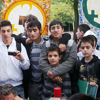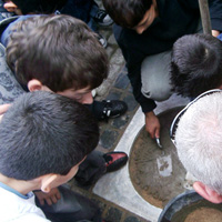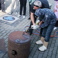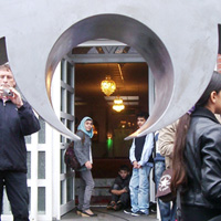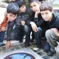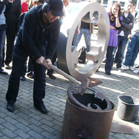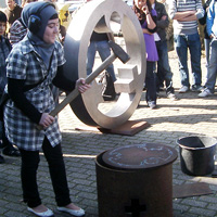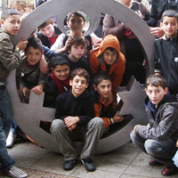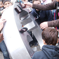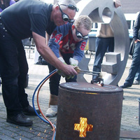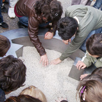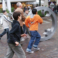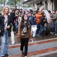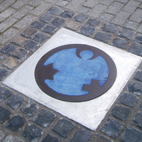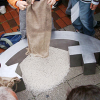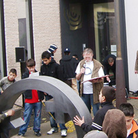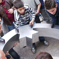 Gemeinsam mit Schülerinnen und Schülern der Gesamtschule Ückendorf bewegen wir am 24. September 2009 die rollende Skulptur des Engels der Kulturen durch die Gelsenkirchener Innenstadt und erzeugen vor dem Heinrich-König-Mahnmal - zu Füßen der Evangelischen und der Katholischen Kirchen -, vor der neuen Synagoge und vor der Moschee Mulvanystrasse jeweils einen Sandabdruck. Am gleichen Tag verlegen wir in feierlichem Rahmen auf dem Schulgelände der Gesamtschule Ückendorf eine Bodenintarsie des Engels der Kulturen und brennen im Anschluß gemeinsam mit den Jugendlichen das Zeichen für die nächste Stadt aus.