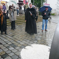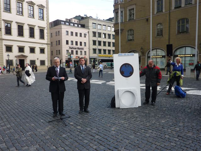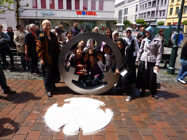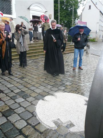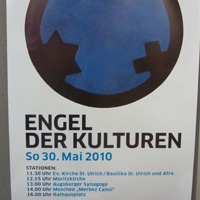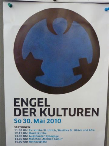 In Begleitung von vielen Bürgerinnen und Bürgern führen wir die Aktion mit dem Rad des Engels der Kulturen in der Augsburger Innenstadt durch. Zunächst findet in der evangelischen Kirche St. Ulrich eine Andacht statt, woraufhin vor dem Portal der Kirche ein Sandabdruck erzeugt wird. Von dort bewegen wir uns zur katholischen Moritzkirche, wo uns ein Trompetensolo aus dem Turmfenster der Kirche empfängt. Auch hier legen wir ein Sandbild u.a. gemeinsam mit einer sich dort aufhaltenden Schulklasse aus Istanbul.