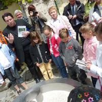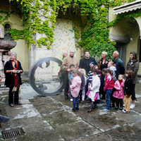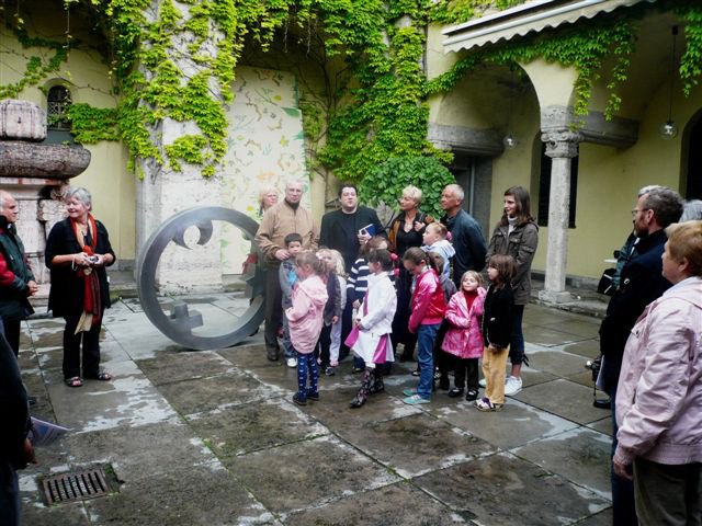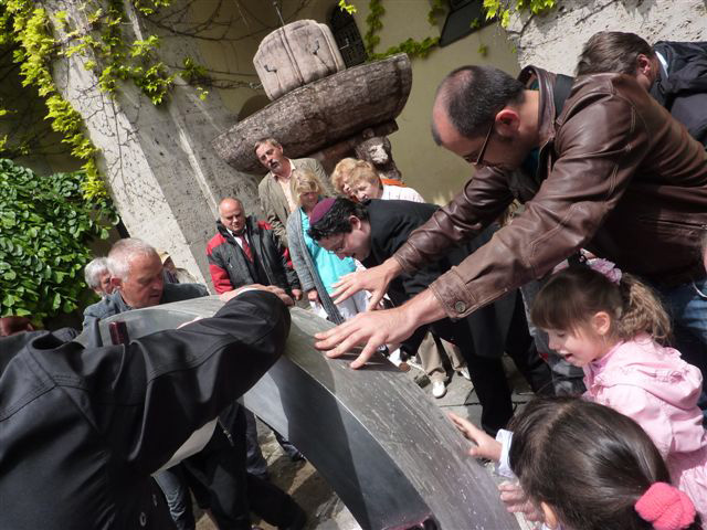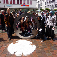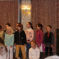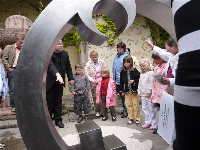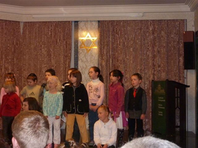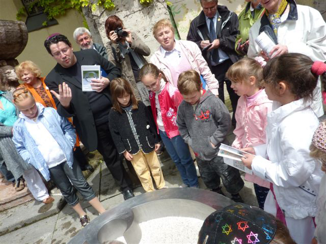 Weiter geht es zur Synagoge, wo wir bereits vom Rabbi und vielen jüdischen Gemeindemitgliedern mit ihren Kindern erwartet werden. Im Innenhof der Synagoge erzeugen wir mit den Anwesenden einen Sandabdruck und sprechen mit den Kindern über das Zeichen und seine Bedeutung. Danach werden wir in den Gemeindesaal gebeten, wo uns die Kinder mit ergreifenden musikalischen Darbietungen erfreuen. Der Rabbi zeigt uns das Innere der eindrucksvollen Synagoge, die den Verwüstungen der Nazizeit standgehalten hat und schon ab 1945 wieder der jüdischen Kultusgemeinde als Zentrum diente.