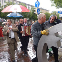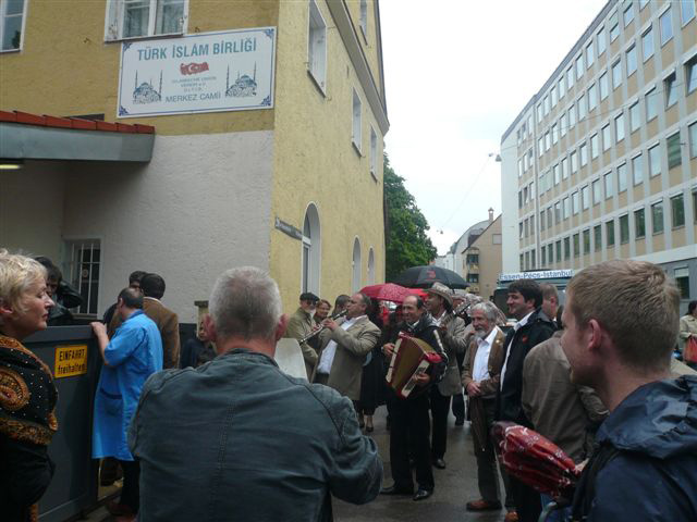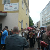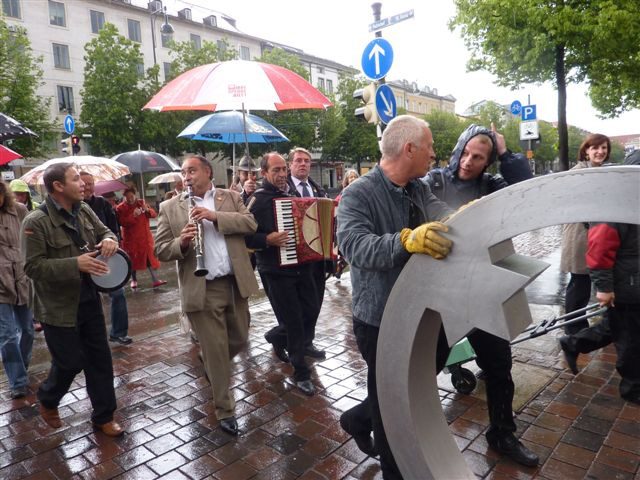 Hier stoßen auch die Roma-Straßenmusiker zu uns, die uns im weiteren Verlauf der Aktion trotz immer wiederkehrender Regenschauer mit ihrer wunderbaren Musik begleiten.