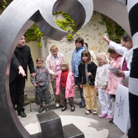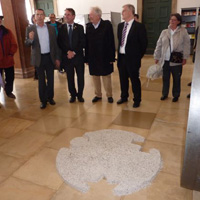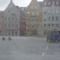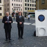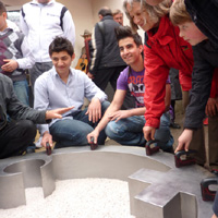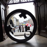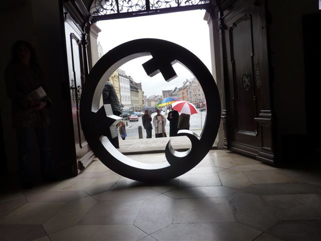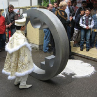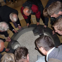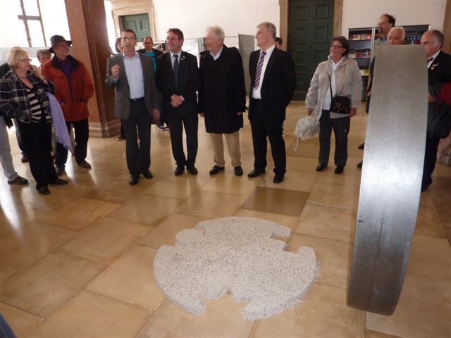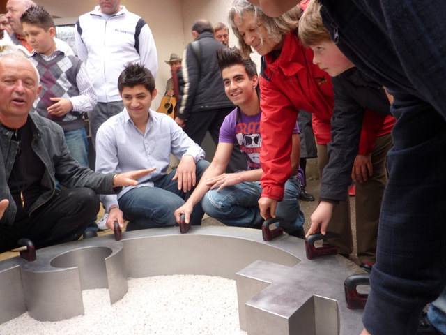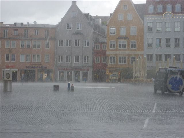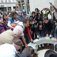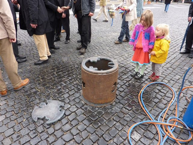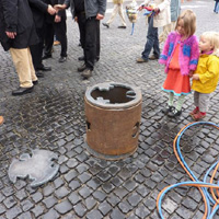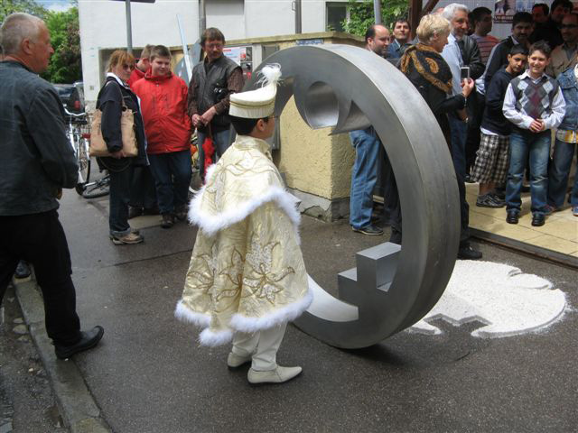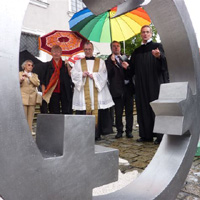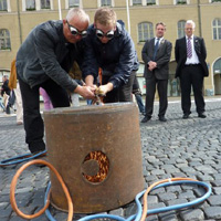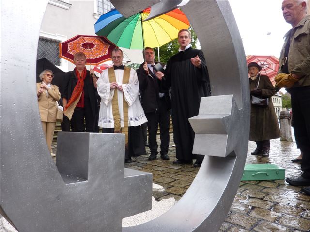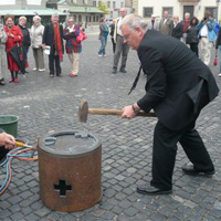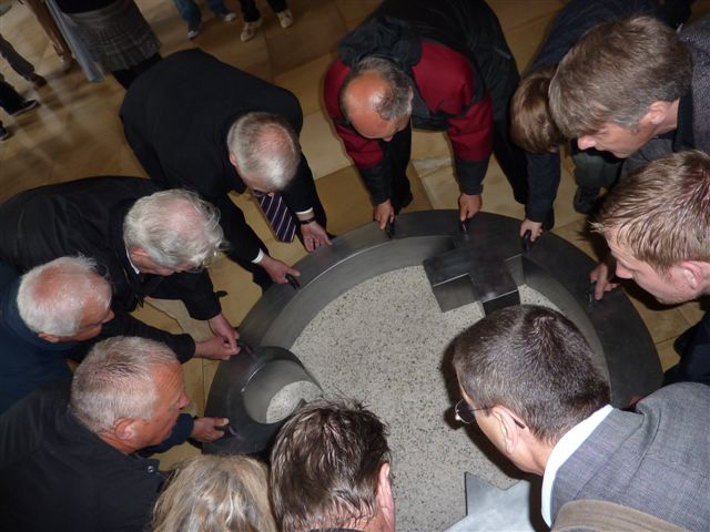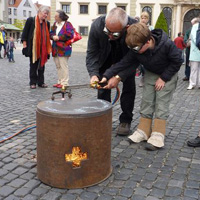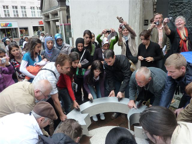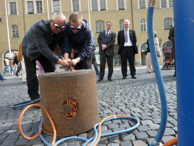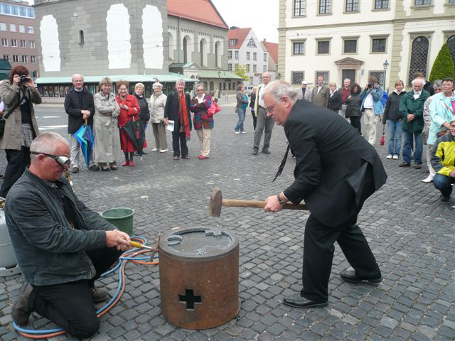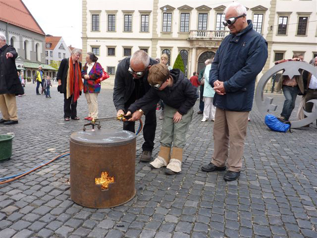 Gestärkt ziehen wir weiter Richtung Rathausplatz, den wir noch bei strahlendem Sonnenschein erreichen. Minuten später zwingt uns ein starker Platzregen ins Foyer des Rathauses. Auch dort erzeugen wir das Sandbild, der Friedenspreisträger der Stadt Augsburg, Helmut Hartmann, Vertreter der Stadt und des Runden Tisches der Religionen legen Hand an. Anschließend können wir, wieder bei schönstem Wetter, auf dem Platz vor dem Rathaus die Aktion fortsetzen. Unter großer Beteiligung von Klein und Groß wird das Zeichen mit dem Schneidbrenner aus Stahl ausgebrannt. Der stellvertretende Bürgermeister nimmt den schweren Hammer zur Hand, um die beiden entstandenen Teile voneinander zu trennen.
