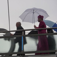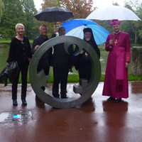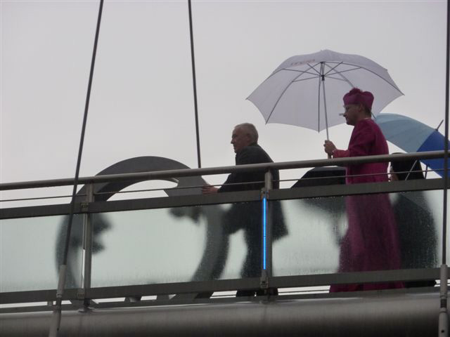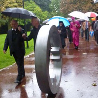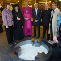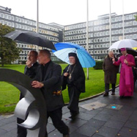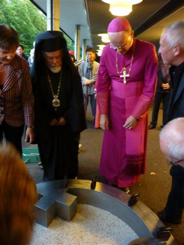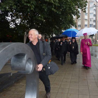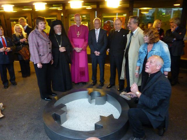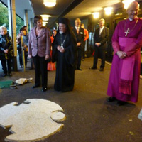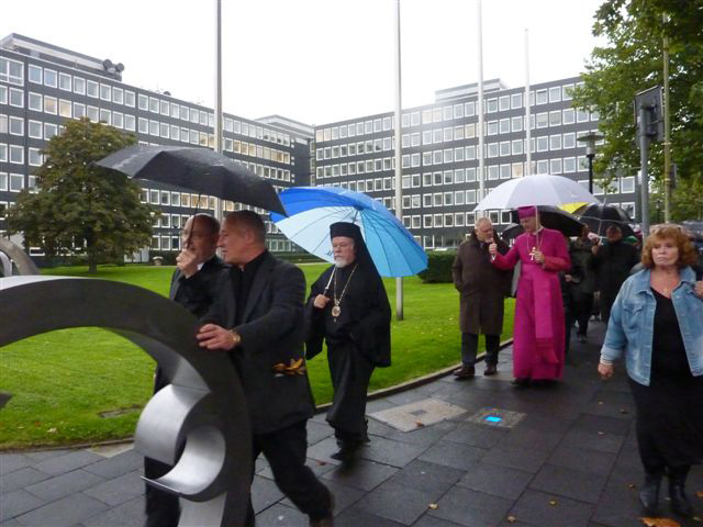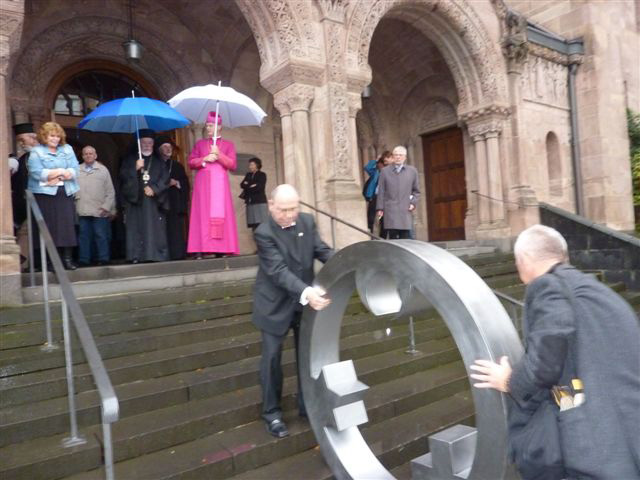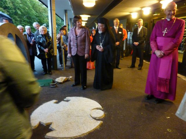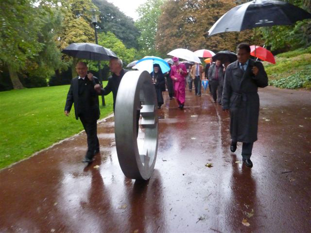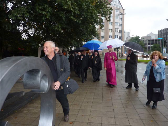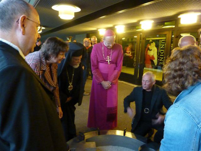 In Begleitung von Präses Nikolaus Schneider, Ruhrbischof Dr. Franz-Josef Overbeck, dem griechisch-orthodoxen Metropolit Augoustinos und vielen anderen bewegt sich die rollende Skulptur des Engels der Kulturen von der Erlöserkirche durch den Stadtgarten zum Aalto-Theater, wo von allen gemeinsam ein Sandabdruck erzeugt wird.