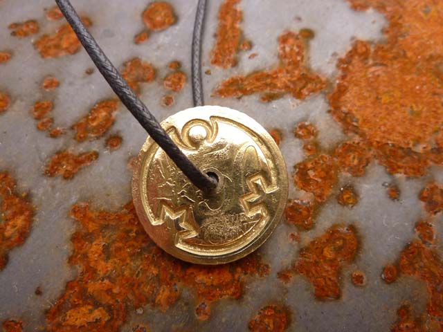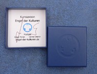 Die Brosche und die Silber-Anhänger werden in einer dunkelblauen Schachtel geliefert, der Deckel ist außen mit dem Engel der Kulturen geprägt, innen gestempelt und signiert, wie hier abgebildet |