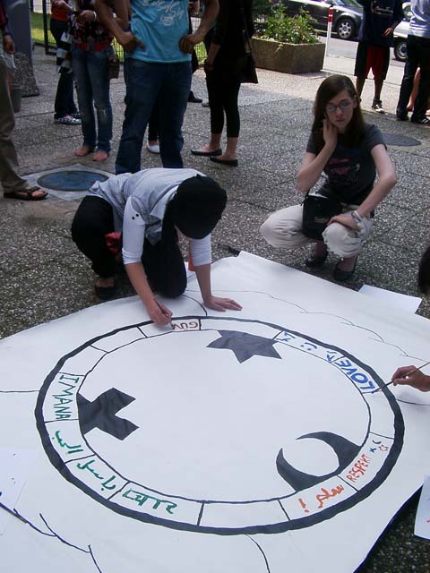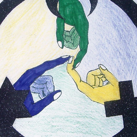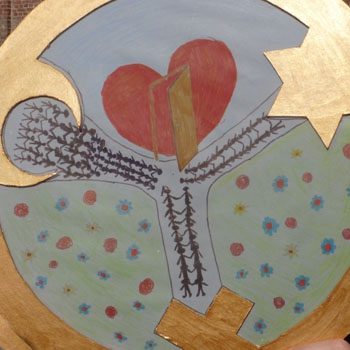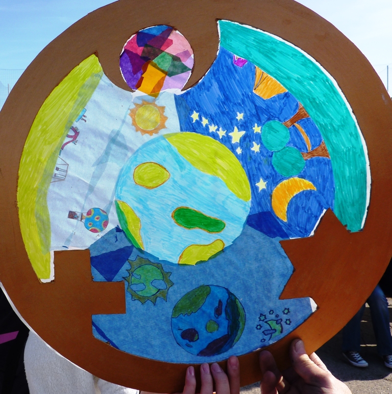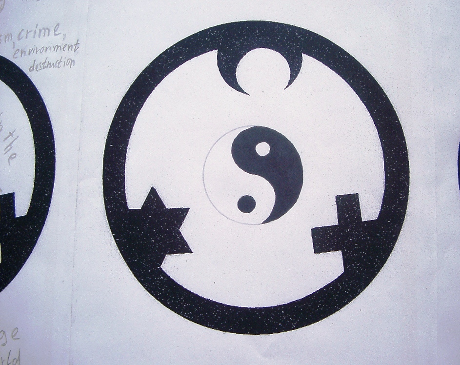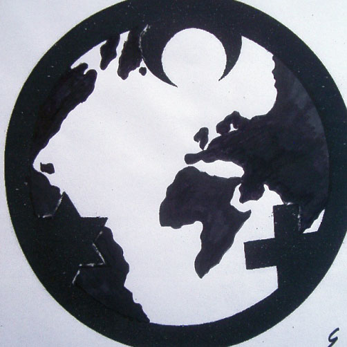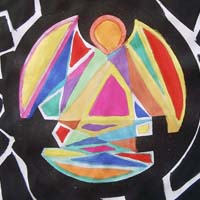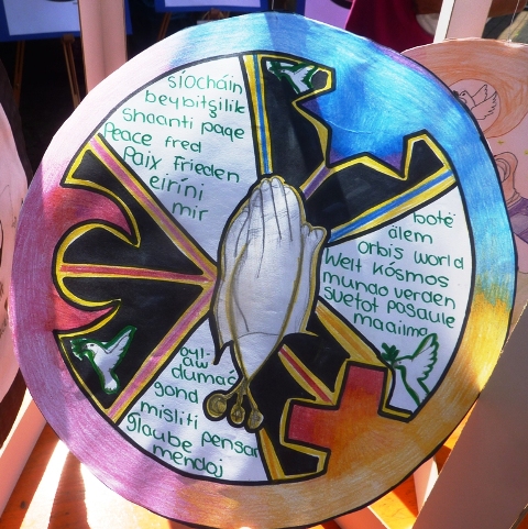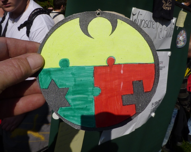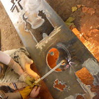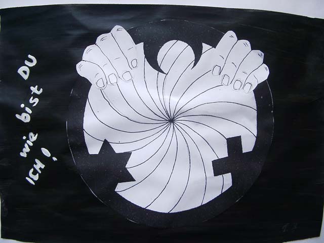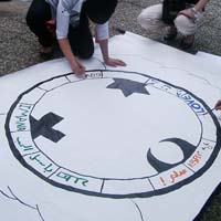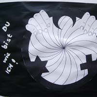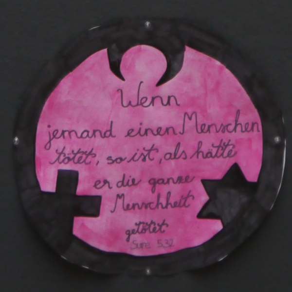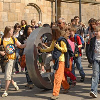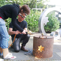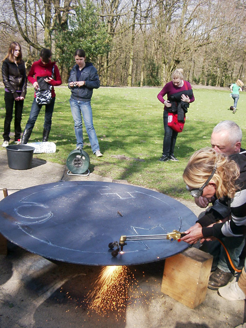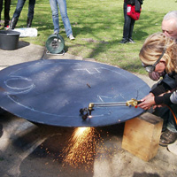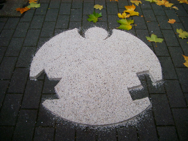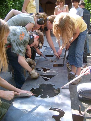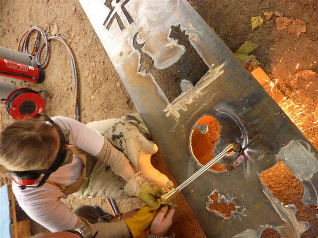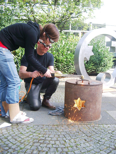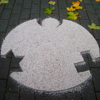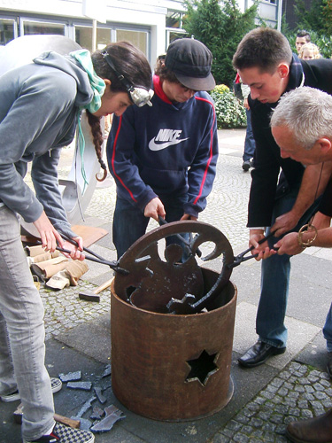Wenn nach der Verlegung der Intarsie mit den SchülerInnen gemeinsam das Zeichen für die nächste Station/ Stadt aus einer runden Stahlplatte mit dem Schneidbrenner ausgeschnitten wird, stellen sie so nicht nur eine Verbindung zum folgenden Verlegeort her, sondern mit dem bei diesem Herstellungsprozeß ebenfalls entstehenden inneren Engel, der am Rand mit Ort und Datum der Aktion versehen wird, wird die Schule, wie alle anderen beteiligten Orte und Schulen, auch Teil der Engel der Kulturen-Säule für Jerusalem (genauere Beschreibung unter "Das Projekt")